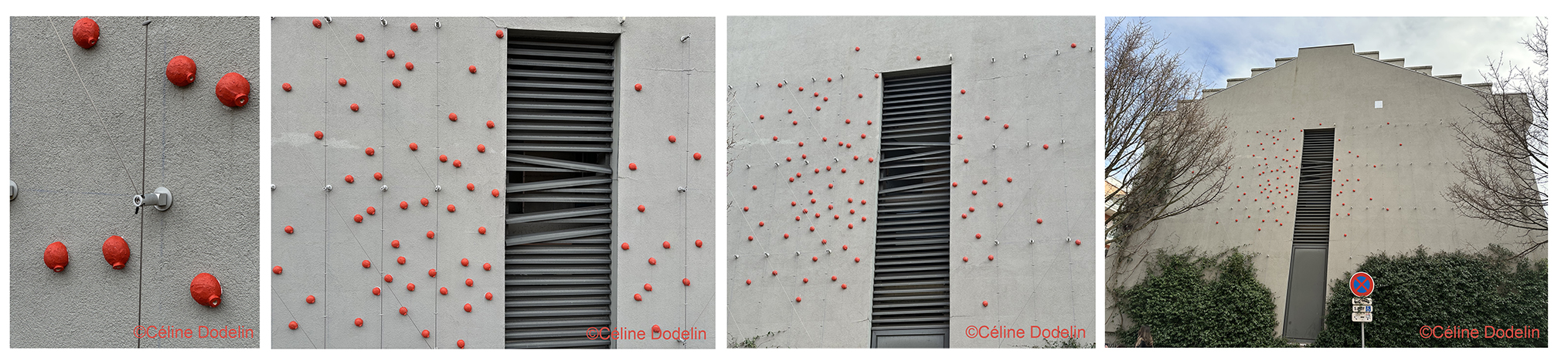 A la manière d’un essaim ou d’akènes s’envolant après un coup de vent, quatre-vingt six architectures en grès s’accrochent sur le mur végétal. Chaque sculpture est aussi un nichoir potentiel pour les pontes d’abeilles sauvages.